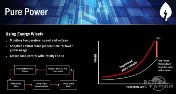 精確功耗控制(Pure Power):超過100個嵌入式傳感器,以毫伏、毫瓦和每攝氏度為單位進行精確控制,實現最佳電壓,時鐘頻率,并提供最小能耗工作模式。