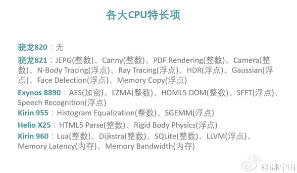 微博網(wǎng)友@冰宇宙 特意整理了驍龍820、驍龍821、Exynos 8890、Helio X25、麒麟955、麒麟960這六大旗艦處理器在GeekBench 4測試中的表現(xiàn),但不是單純的總分,而是細分到各個子項目。