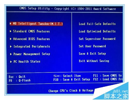 4、如下圖,進(jìn)入到MB inteligent tweaker; 用上下左右鍵選擇,回車鍵進(jìn)入,不同的BIOS界面有所不同,大部分配置都在左邊的前三行,右邊那些配置保存和導(dǎo)出的選項(xiàng)所有的主板都有,但暫時用不上,電源和狀態(tài)管理也沒用。