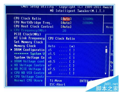 6、CPU clock ratio處配省為AUTO,回車后出來一堆數(shù)字,由小到大依次排列。下面來換算一下,外頻是20MhZ,那缺省的320Mhz就是16倍,因此要超的話,要調(diào)得比16大,建議先不要超太多,10-15%即可。