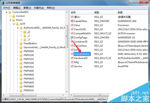 5、最后對FriendlyName里的名字進行任意修改,這是對cpu的名字進行任意修改,下面1至...里的每個FriendlyName修改的名字都一樣