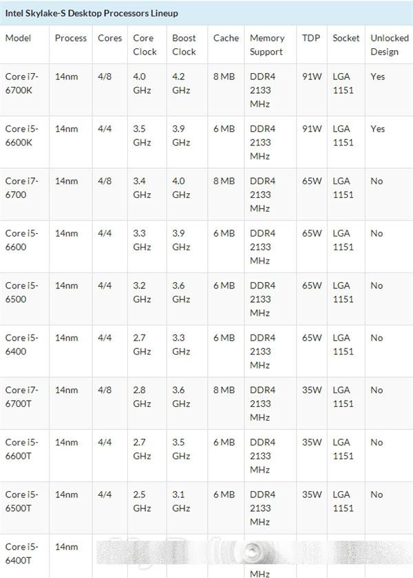 很明顯,i7系列延續了四核心八線程、8MB三級緩存的風格,i5系列則還是四核心四線程、6MB三級緩存。熱設計功耗標準版都是65W,節能版則是35W,依然和傳統保持一致。換句話說,這一代基本只是變了變頻率、支持了DDR4內存、改成了LGA1151接口而已,但是憑借新的14nm工藝,實際功耗表現可期。