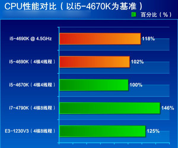 通過測試,可以看出在非超頻情況下,i5-4690k性能相比上一代i5-4670K僅提升了2%,性能比主打高性價比的E3-1230V3高端處理器,性能低了23%。不過i5-4690k在穩定超頻到4.5Ghz后,性能相比i5-4670K提升16%,但還是稍低于E3-1230V3處理器,畢竟E3是一款四核八線程處理器。