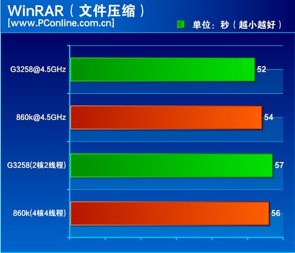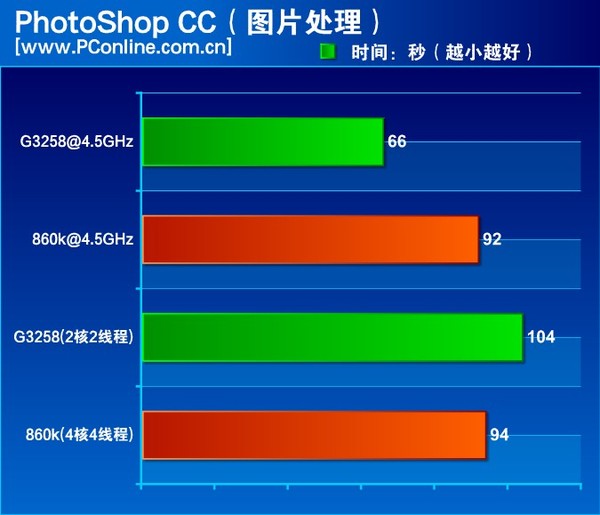 測試小結:WinRAR和PhotoShop是網友較為常用的軟件,對CPU微架構、核心數、內存性能和緩存都比較敏感,在WinRAR測試項目里,新速龍四核 860K小幅度后落,核心數和線程數都占優的速龍比不上奔騰?由此推斷CPU微架構還是Intel做得比AMD的要好。