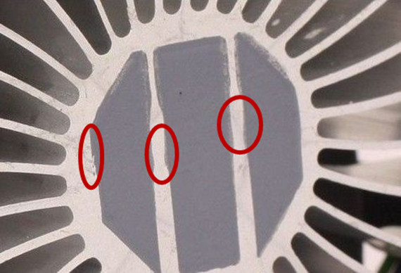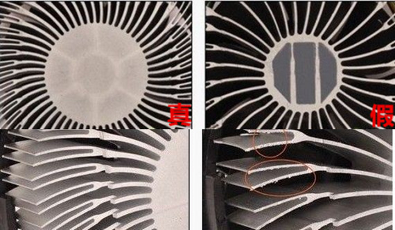 7、散熱鋁片。左邊真貨散熱片中心部分的鋁柱粗大,散熱片均勻密集分布,規律形狀,片與片間距相等。假貨明顯可以看出做工粗糙,鋁柱細小,形狀大小不一,片與片間距不一,很山寨。