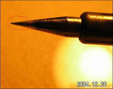 這里除了要求電烙鐵頭部一定要尖外,還須注意烙鐵頭是否沾錫,使用時要保持尖部也有均勻的一層焊錫。在一般地攤上10元左右的電烙鐵所用材料比較差,很難在頭部上錫。解決的辦法可以找直徑3~4mm以上的銅絲磨尖替換掉原來的烙鐵頭。
