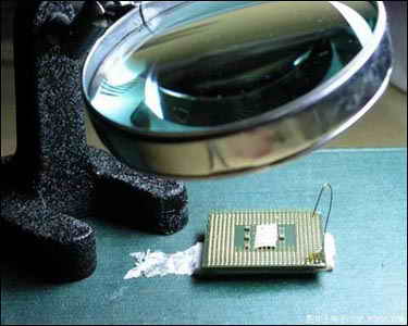 還要說的是,CPU原來的焊點融點都很高,平常用250度的檔就可以融化焊錫了,但在這塊CPU上用400度的檔才可以。但這樣電烙鐵溫度過高時會有氧化層,因而就不粘錫了,所以要準備一塊濕布,遇到到烙鐵不粘錫了就趁熱擦掉氧化層,再重新上錫。