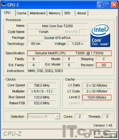 先來看看T2250的參數。從CPU-Z截圖可以看到,T2250的核心代號為Yonah,采用65納米工藝制造,步進為C0。T2250支持的指令集為MMX、SSE、SSE2、SSE3,并不支持Intel EM64T技術。T2250的前端總線為533MHz,打開EIST節能技術支持后,空閑狀態是核心頻率自動降為800MHz。此外在這里還可以看到T2250的一級緩存容量為每個核心64KB,兩個核心共享2MB二級緩存。