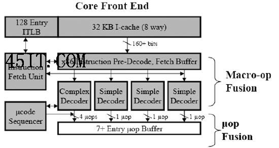 在處理器內(nèi)部,x86指令被稱為Macro-ops,而內(nèi)部指令被稱為uops,而Macro-ops融合可以將兩個(gè)Macro-ops融合成一個(gè)uops。舉個(gè)例子來(lái)說(shuō),我們可以把x86 Compare(比較)指令與x86 Jump(跳轉(zhuǎn))指令融合在一起,生成一條單獨(dú)的uops(比較并跳轉(zhuǎn)指令)。在Core中每個(gè)解碼器都可以完成這樣的優(yōu)化工作,但是每周期內(nèi)最多只能有一個(gè)解碼器完成這樣的融合,所以最大指令解碼帶寬是每周期4 1個(gè)x86指令。