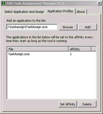 第二個面板才是這款軟件的重點,它可以指定分配方案,并且記住,下次只要再開程序還是會產生效果。分配方法是:用Browse找到要分配的程序,點Add后,指定一個CPU。
