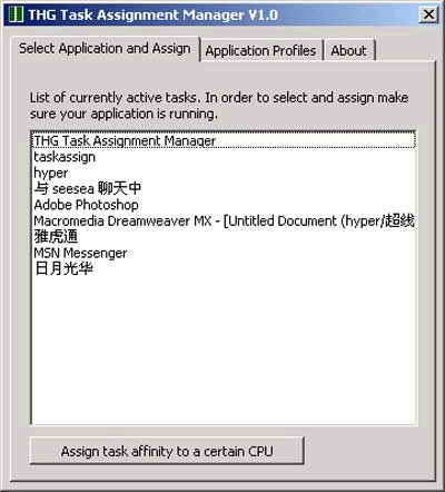 筆者介紹一種更有效的工具:THG Task Assignment Manager。這本來是一款用在多處理器系統里面分配任務的工具,但是因為超線程系統也有兩個處理器,加上它可以解決上文所說的問題,所以這里成為任務管理器的替代者很合適。下載之后,直接解開運行,看到程序主界面。