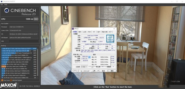 酷睿i3-9350K在5.0GHz時在Cinebench R20跑分1999分,而未超頻時分數為1975 ,提升了大約10%左右,非常給力。
