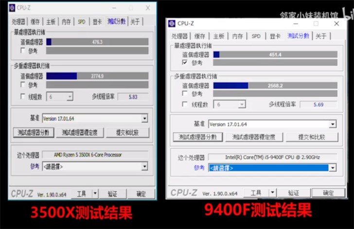 @鄰家小妹裝機館在MSI B450M主板上進行了測試,搭配3000MHz運行的16GB DDR4內(nèi)存和GeForce GTX 1660 6GB顯卡。在CPU- Z測試中時,AMD Ryzen 5 3500X在單核測試中獲得476.3分,而Core i5-9400F獲得451.4分。在多線程測試中,AMD的Ryzen 5 3500X得分為2774.9分,英特爾為2568.2分。