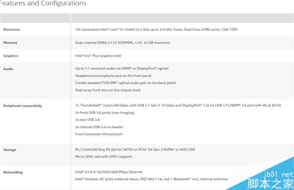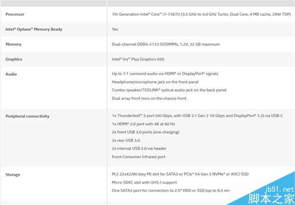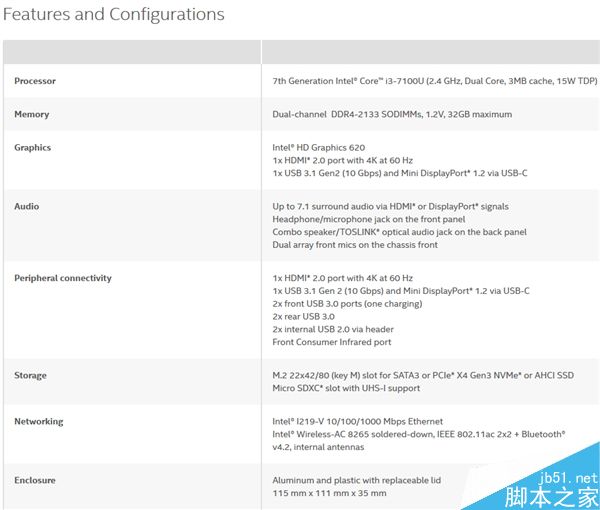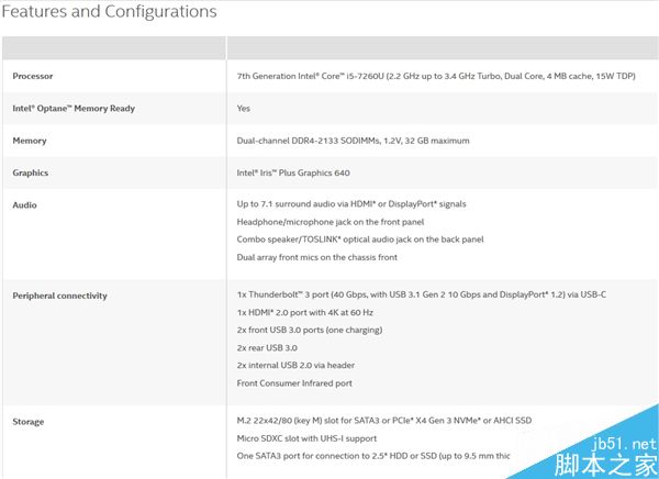 和之前一樣,新NUC依然搭載是七代酷睿家族中的超低電壓版本U系列。其中,i3版本搭載的是Core i3-7100U(雙核2.1GHz,15W TDP),i5版本搭載的是Core i5-7260U(2.2GHz,可加速到3.4GHz,15W TDP),i7版本搭載的是Core i7-7567U(3.5GHz,可加速度到4.0GHz,28W TDP)。