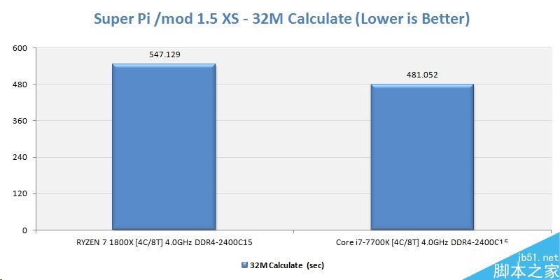 SuperPI 32M:Ryzen慢了超過1分鐘,差距約12%。Intel在內存性能方面有優勢。