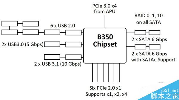 B350芯片組本身并不提供PCIe 3.0通道,而只支持相對落后的PCIe 2.0,而且只有4條。因此B350所能提供的USB 3.0、USB 2.0及SATA接口數量只能達到基本水平。