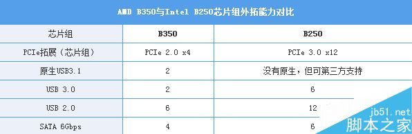 首先看看主流的。說句題外話,如果不加陣營名字,估計有一些與世隔絕了半年的朋友看到B350與B250后第一反應就是Intel的橫向對比吧!其實是AMD B350以及Intel B250芯片組。