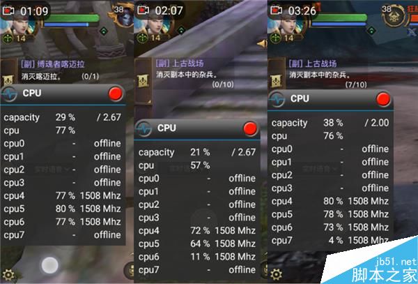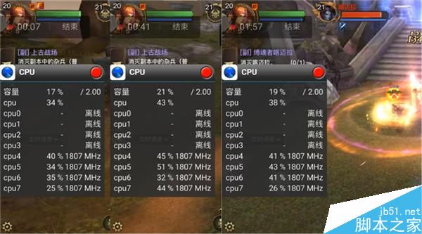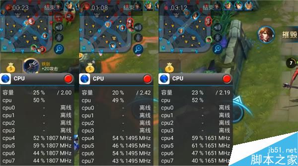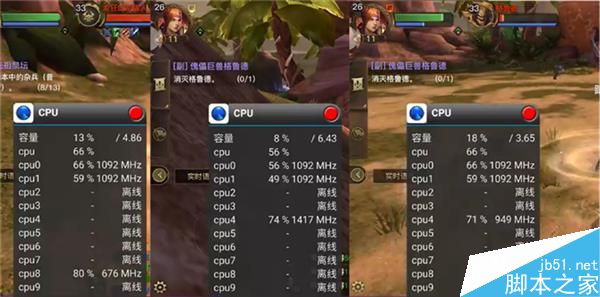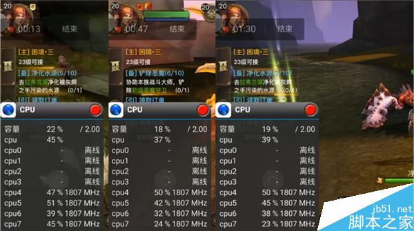 值得一提的是,Helio X20雖然關閉了一半以上核心,但是并沒有極端到“一核有難九核圍觀”,相反,在戰斗場景中核心和大核心偶爾還會分擔一下運算量。