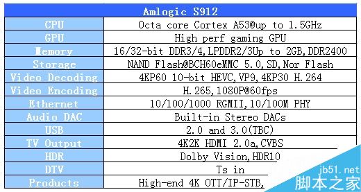 S912 同時搭載AVE-10 視頻處理引擎,可加速進行視頻編碼,功能強大的視頻引擎可支持HEVC和VP9兩種格式的4K2K 60幀視頻解碼,提供無屏閃的視覺體驗, AVE-10同時支持Trusted Video Path(TVP)以及視頻水印技術,支持Dolby Vision、HDR10多種HDR格式,因此也適用于各種高安4K DRM場景,輸出則兼容了HDMI2.0a和CVBS。作為新一代的處理器,Amlogic S912定位在高端4K OTT盒子和游戲盒子領域,注定將會帶來非凡的影音娛樂體驗。