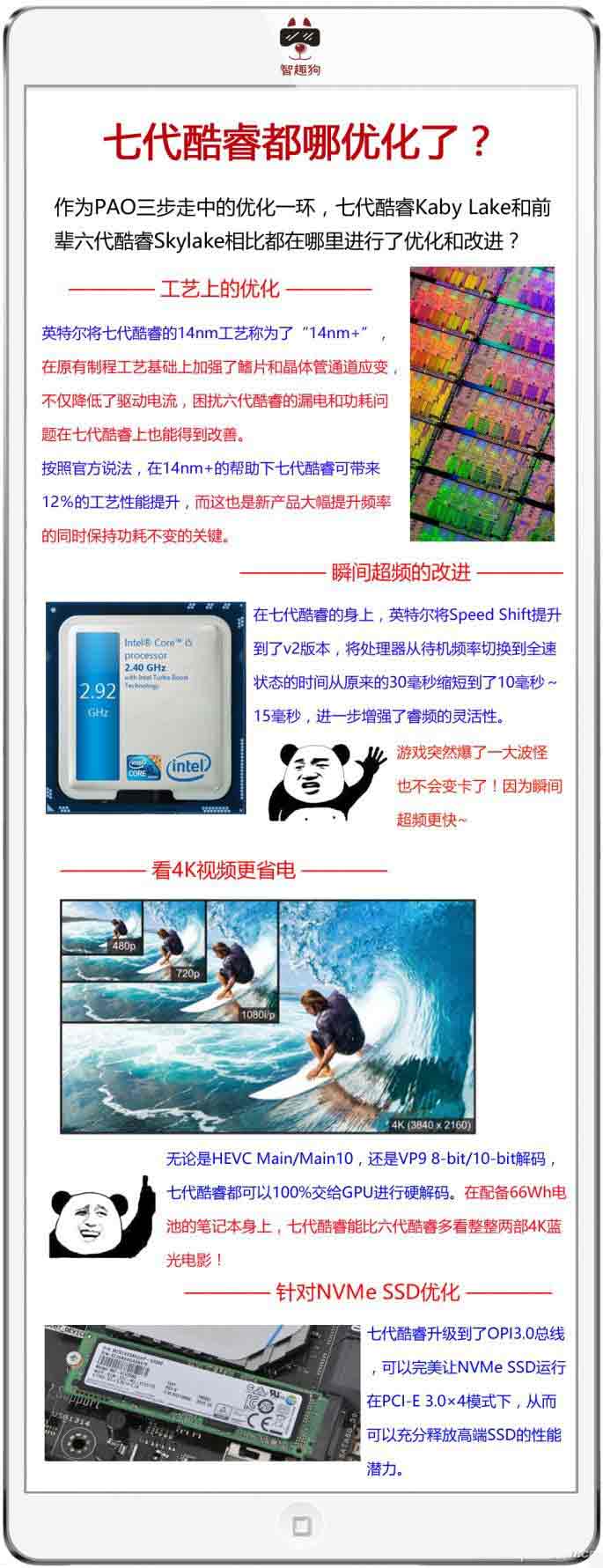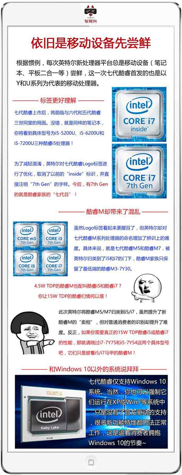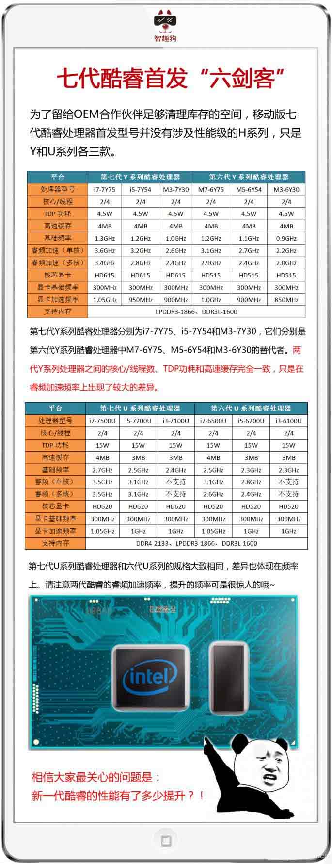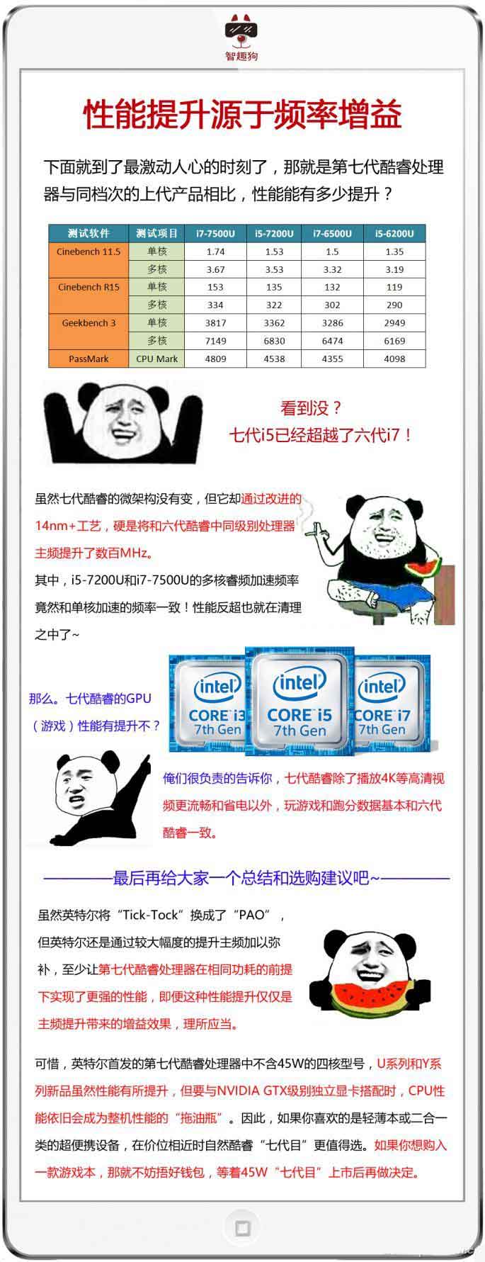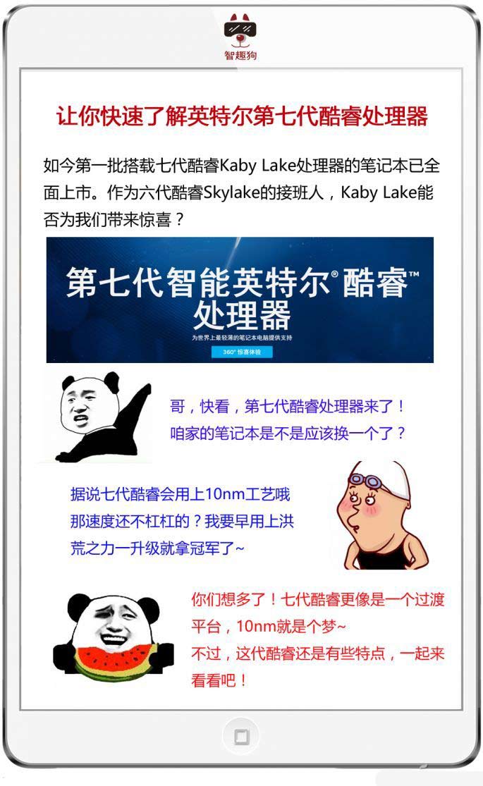 為了便于大家理解,智趣狗此次還是給童鞋們帶來(lái)了6張表情包圖片,相信能讓你在很短的時(shí)間里,就能搞清楚第七代酷睿處理器到底有了哪些改進(jìn),以及它的性能有多強(qiáng)?現(xiàn)在是否值得入手等問(wèn)題!