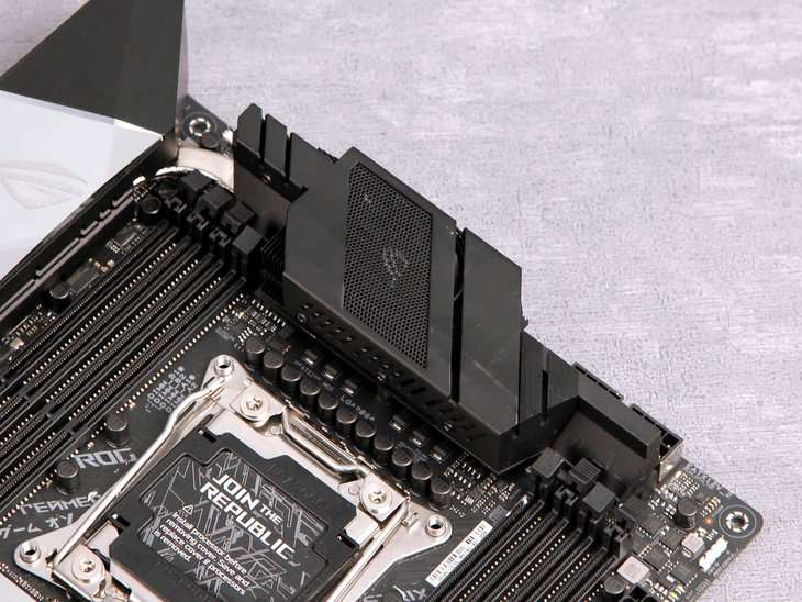 拆卸掉一體化主動式散熱器,我們能夠一覽這款主板的CPU供電設計。其配備了13相供電模組,用料相當出色,能夠為CPU提供強勁又穩定的電力支持,滿足更高的超頻需求。