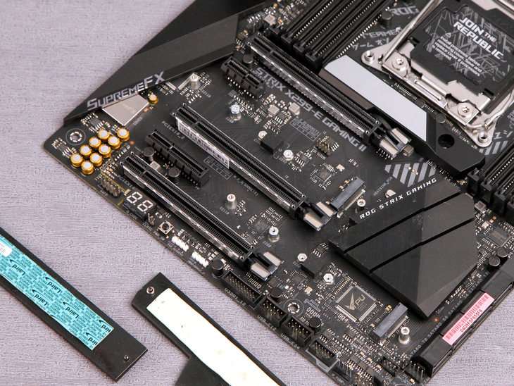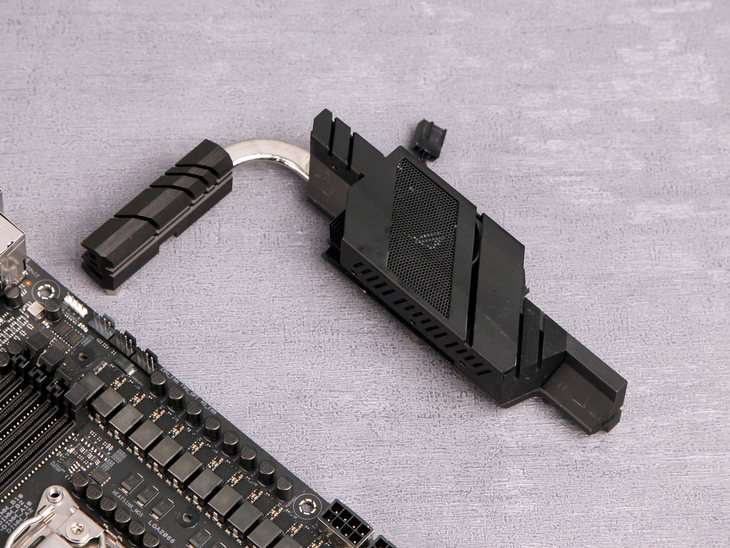 PCIe擴展區域的散熱片下面設計了兩處M.2固態硬盤安裝位。加裝的散熱片可以為M.2固態硬盤提供散熱作用。