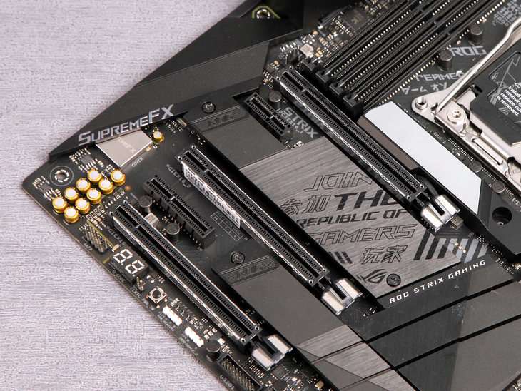 這款主板的PCIe擴展區域擁有三條PCIe 3.0 x16插槽、一條PCIe 3.0 x4插槽、一條PCIe 3.0 x1插槽。