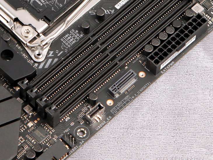 24pin主電源接口的旁邊還設計了一個M.2接口。該接口采用垂直設計,用戶需要借助安裝支架來安裝M.2固態硬盤。