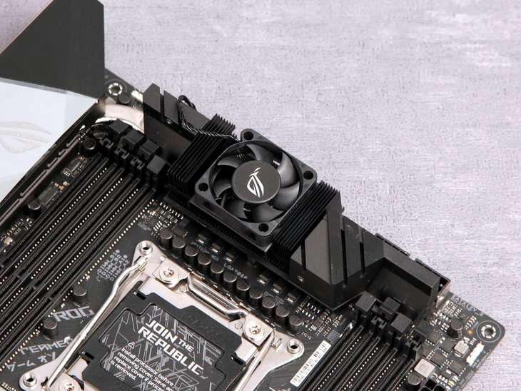 這款主板CPU供電區域的MOS管加裝有一體化主動式散熱器。