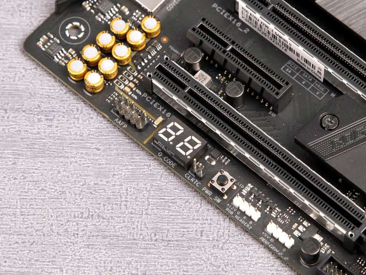 主板PCB的左側邊緣設計了開機鍵,該鍵的旁邊擁有一個Q-Code偵錯燈。