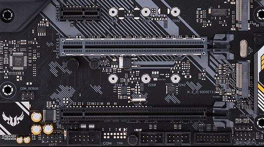 在主板的下方可以看到搭載了2個M.2 Socket 3 插槽,可支持到32G/s的傳輸速度。還可看到兩個PCIe 3.0/2.0 x16 擴展卡插槽,其中一條插槽加入了SafeSlot高強度安全插槽,既可以保護插槽在安裝顯卡時免受損壞也可以保護顯卡的金屬針腳受損。