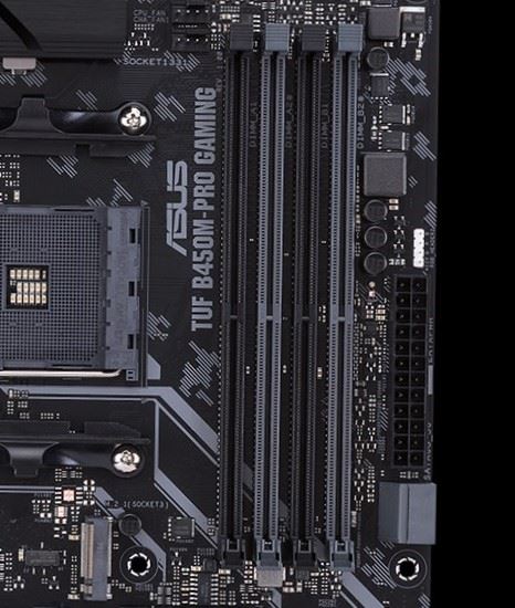 TUF B450M-PRO GAMING主板和ATX主板一樣擁有4根內存插槽,支持最大64G DDR4-3533內存。在邊上還可以看到為內存插槽配備的獨立供電模塊。