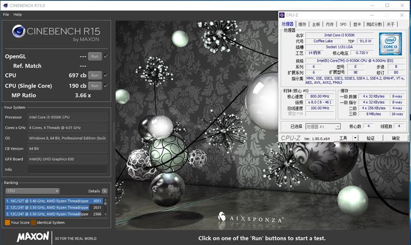在CineBench R15測試中,i3-9350K的單線程分數為190cb、多線程分數為697cb。