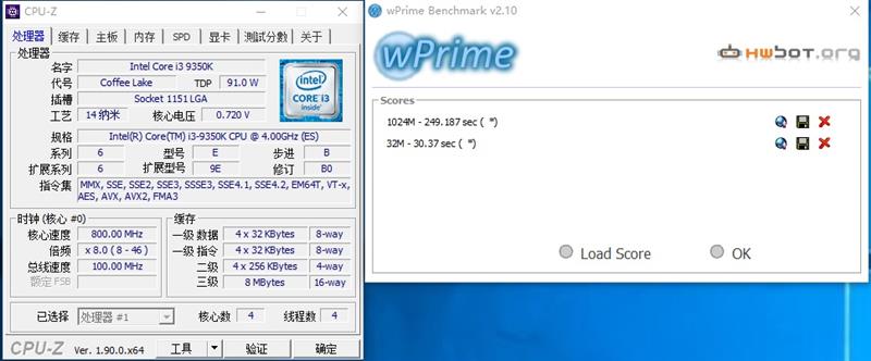 i3-9350K跑完wPrime 32M單線程性能測試花掉了30.3秒;而wPrime 1024M多線程測試則用掉了249秒。