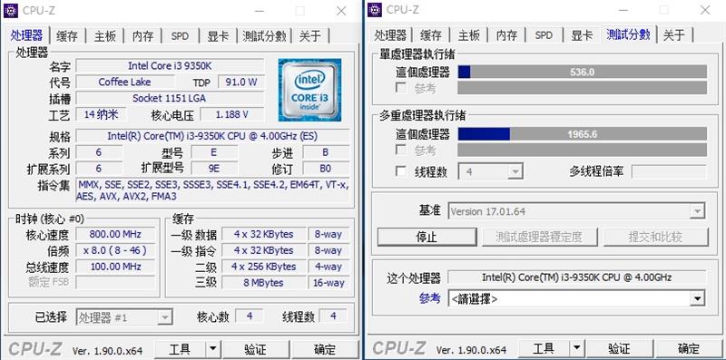 在CPU-Z中,i3-9350K的單線程分數為536、多線程分數為1955。