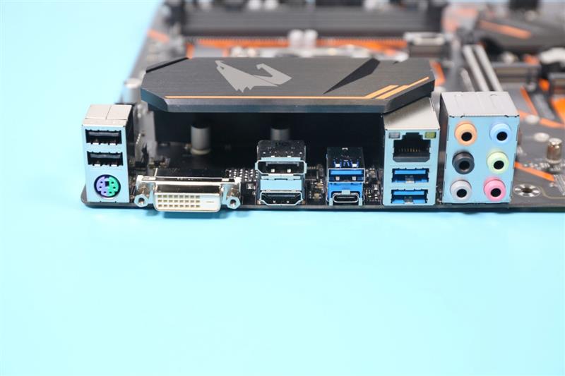 背部的I/O接口,有2xUSB2.0、4xUSB 3.0、1xType-C、1xHDMI 2.0、1xDP1.4、1xDVI、1xRj45、6x3.5mm音頻以及一個已經不常見的PS/2接口。