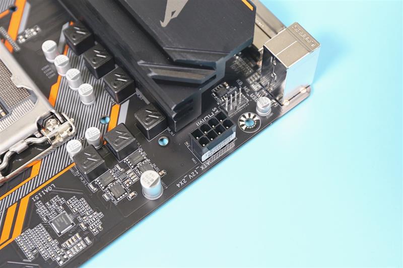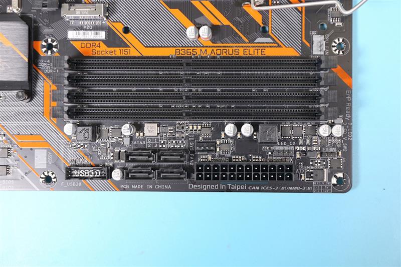 技嘉B365M Aorus Elite主板整體采用黑橙配色,電容類等元器件和技嘉“小雕”則以原汁原味的銀色金屬呈現。