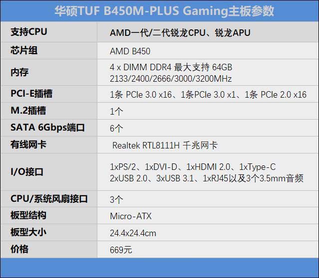 華碩TUF B450M-Plus GAMING主板參數如下: