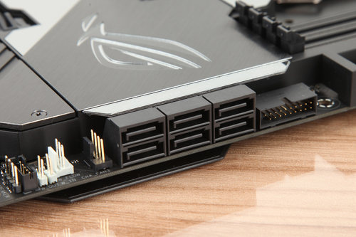 在主板右側,M11F配備有六個朝外方向配備的SATA 3.0接口,采用三個一組的疊放式設計有效減少了對主板空間的占用,朝外方向的設計更方便了裝機排線,玩家可以通過這些接口連接高速大容量硬盤,拓展主機存儲空間。