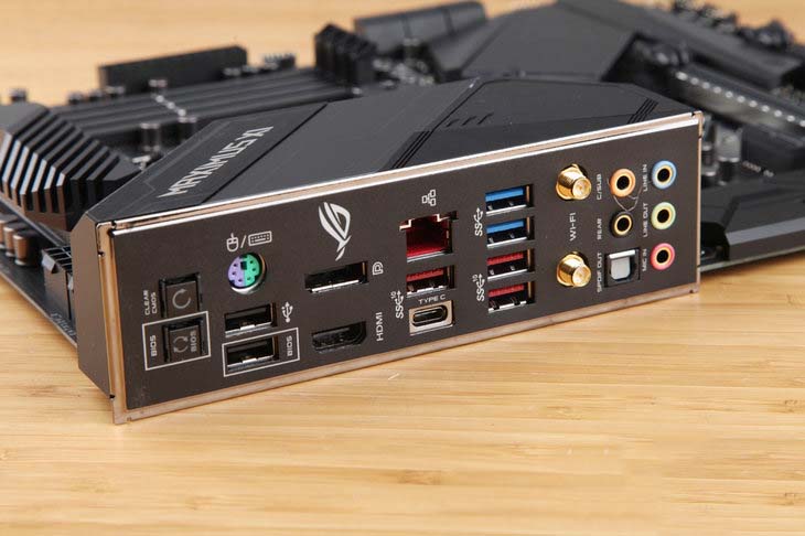 華碩ROG MAXIMUS XI HERO WiFi主板添加了原生USB 3.1 Gen2接口的支持,采用一體化I/O面板,內置Clr CMOS按鍵以及BIOS Flashback按鍵,接口方面包含有一個PS/2接口、一個HDMI 2.0接口、一個DP接口、兩個USB 2.0接口、兩個USB 3.1 Gen1接口、四個原生USB 3.1 Gen2接口(3×USB Type-A接口+1×USB Type-C接口)、一個RJ45網絡接口、WiFi無線接口(WiFi型號為Intel AC-9560,支持802.11ac協議和藍牙5.0),最后就是一個S/PDIF 光纖接口和五個音頻插孔。