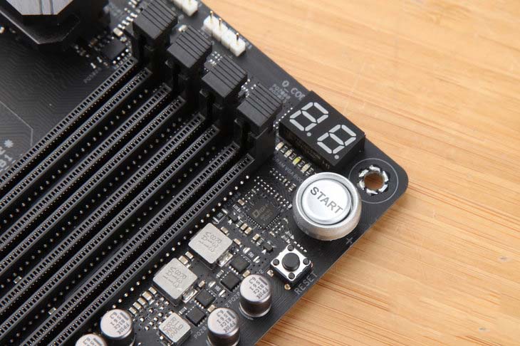 在主板頂部分別有開機鍵和重啟鍵,以及可以讓用戶清楚了解故障原因的Debug 燈。