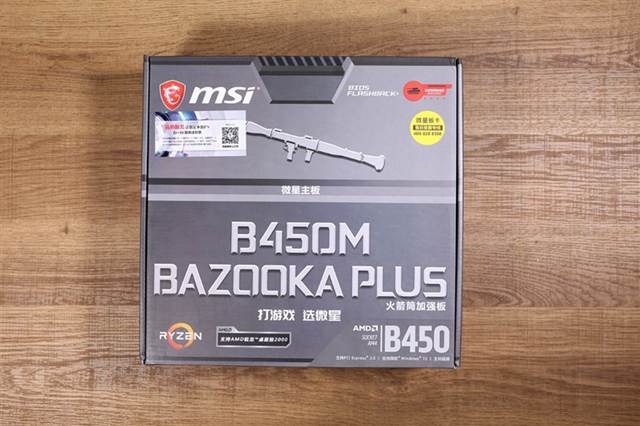 包裝盒整體為灰色格調(diào),中間是主板型號“B450M BAZOOKA PLUS”,上邊的火箭筒表明了主板的身份,隸屬于微星“游戲軍火庫”系列。