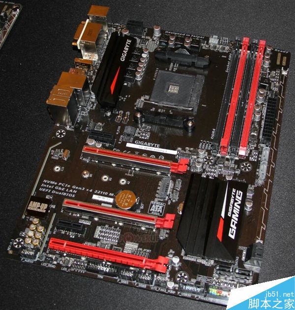 接下來是AX370 Gmaing K5,隸屬于Aorus電競序列,7相供電和鐵氧體電感,還有RGB LED裝飾燈。三條PCI-E 3.0 x16(x16/NA/x4或者x8/x8/x4)、三條PCI-E 3.0 x1,八個SATA 6Gbps,兩個SATA Express 16Gbps,一個32Gbps M.2,四個USB 3.1,六個USB 3.0,八聲道AMPUp!,Intel千兆網卡。