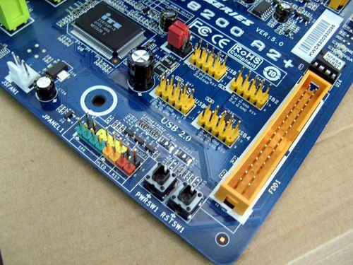 這款主板和上一張圖的主板一樣,都采用9針定義開(kāi)關(guān)/復(fù)位/電源燈/硬盤燈