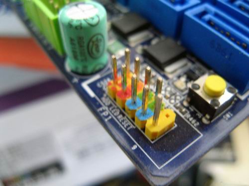 除了前面那款主板,還有一些主板的接線規(guī)律并不太明顯,但是這些主板都在接線的旁邊很明顯的標(biāo)識(shí)除了接線的方法(實(shí)際上絕大多數(shù)主板都有標(biāo)識(shí)),并且在插針底座上用顏色加以區(qū)分,如上圖。大家遇到這樣主板的時(shí)候,就按照標(biāo)識(shí)來(lái)插線就可以了。