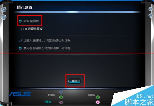 8、插孔設(shè)置里設(shè)置為AC97前面板,點擊確定