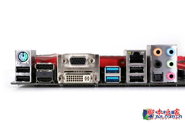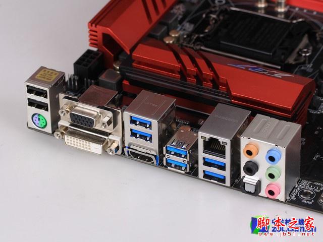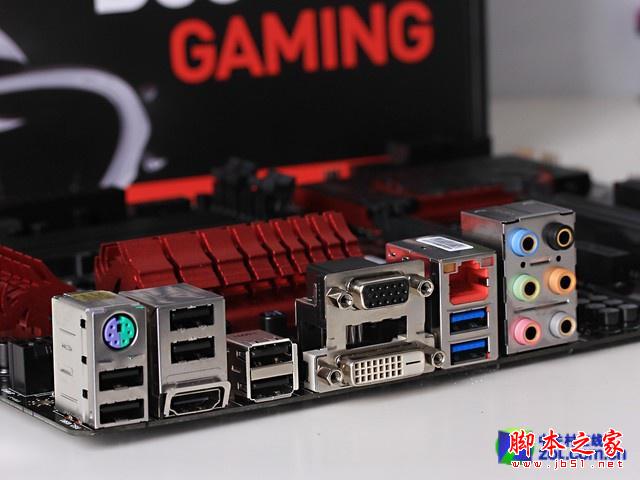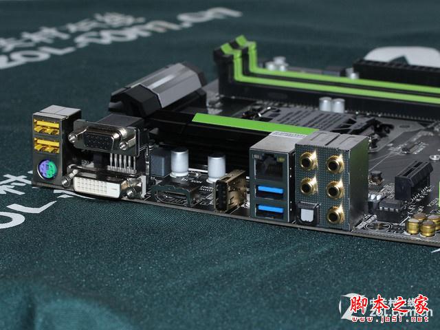 主板的磁盤接口部分,帶有1個PS/2 Combo接口,2個USB 2.0接口,1組VGA/DVI/HDMI視頻輸出接口,6個USB 3.0接口,1個千兆網絡接口,1組8聲道高清音頻接口,1個數字光纖音頻輸出。內存部分,則帶有4條DDR3插槽,最大可以支持32GB雙通道內存組合,并且允許用戶將內存超頻至3200MHz以上頻率。