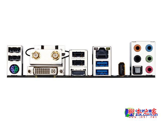 主板背部I/O擴展部分,擁有1個PS/2鍵盤/鼠標插座,1個DVI-I插座,1個HDMI插座,2個Wi-Fi天線接頭孔,2個USB 3.0/2.0端口,5個USB 2.0/1.1端口,1個RJ-45埠,1個S/PDIF光纖輸出插座,5個音源接頭,已經可以滿足大部分玩家的日常需求。