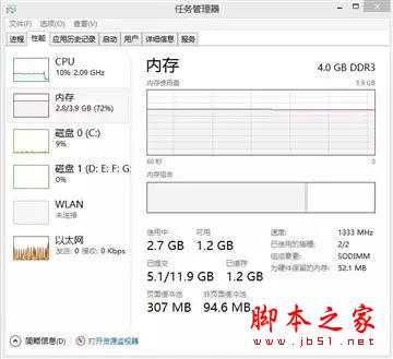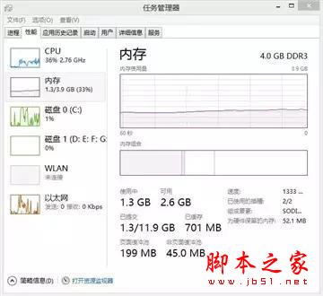 筆者使用的筆記本電腦也是4GB內存,在早上開機時內存占用約為1.3GB,在下班時的內存約占用2.7GB。對于筆者這樣的輕辦公型用戶來講,4GB內存基本能夠滿足使用,但同時打開PS、Office等辦公程序時偶爾會有卡頓現象出現,因此只要任務稍加繁重,4GB內存就顯然不夠使用。