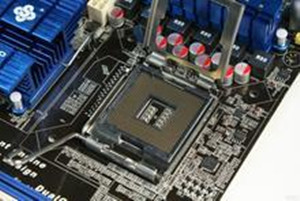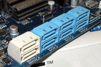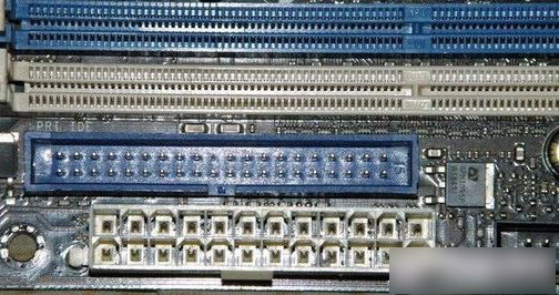 此圖為內存插槽下面的藍色和白色的接口,即IDE接口和主板整體供電接口,一般是24pin。IDE接口,目前已經退出市場。